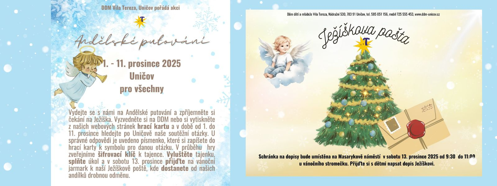 Vydejte se s námi na Andělské putování a zpříjemněte si čekání na Ježíška. Vyzvedněte si na DDM nebo si vytiskněte z našich webových stránek hrací kartu a v době od 1. do 11. prosince hledejte po Uničově naše soutěžní otázky. U správné odpovědi je uvedeno písmenko, které si zapíšete do hrací karty k symbolu pro danou otázku. V průběhu hry zveřejním šifrovací klíč k tajence. Vyluštěte tajenku, splňte úkol a v sobotu 13. prosince přijďte na vánoční jarmark k naší Ježíškově poště, kde dostanete od našich andílků drobnou odměnu.