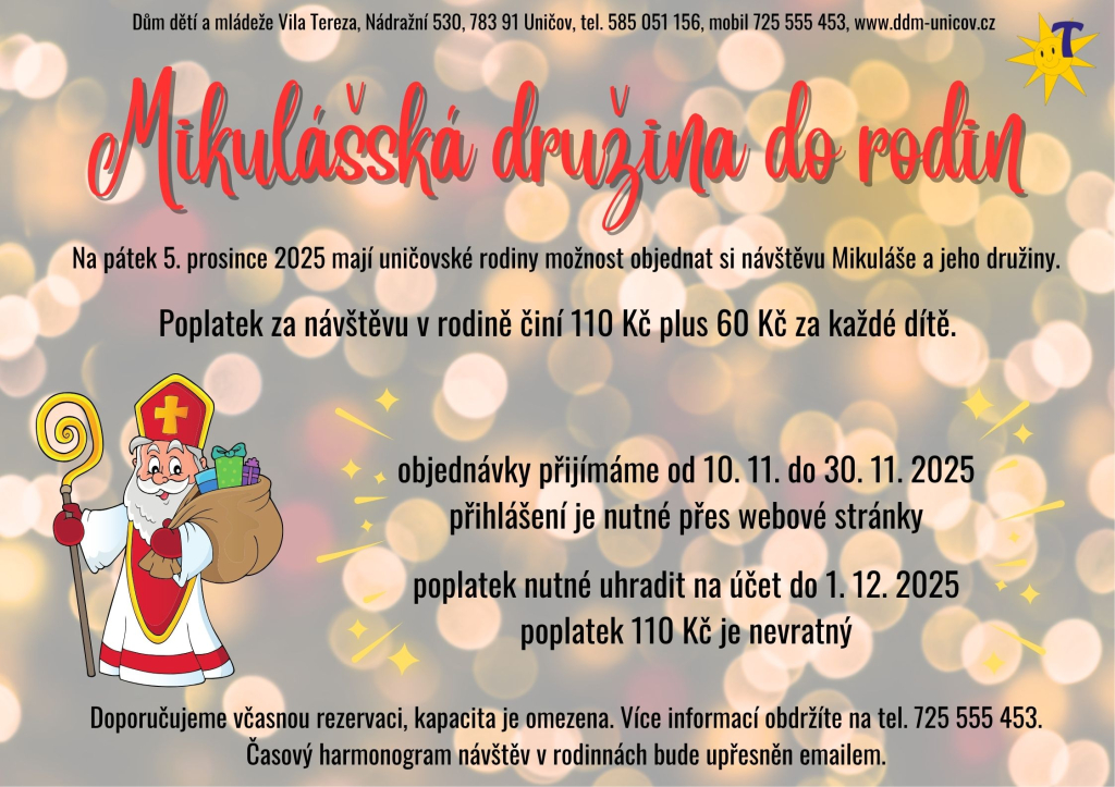 Na pátek 5. prosince 2025 mají uničovské rodiny možnost objednat si návštěvu Mikuláše a jeho družiny.