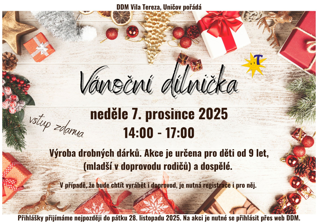 Na akci je nutné se přihlásit přes naše webové stránky. V případě, že chce tvořit i doprovod, je nutná registrace i pro něj. Přihlášky přijímáme do pátku 28.11.2025.