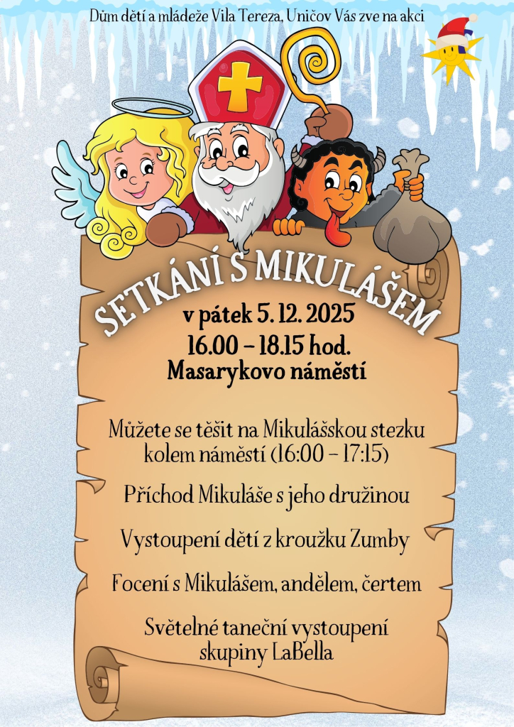 Zveme všechny malé i velké na setkání s Mikulášem, které se bude konat v pátek 5.prosince 2025 na Masarykově náměstí od 16 hodin.